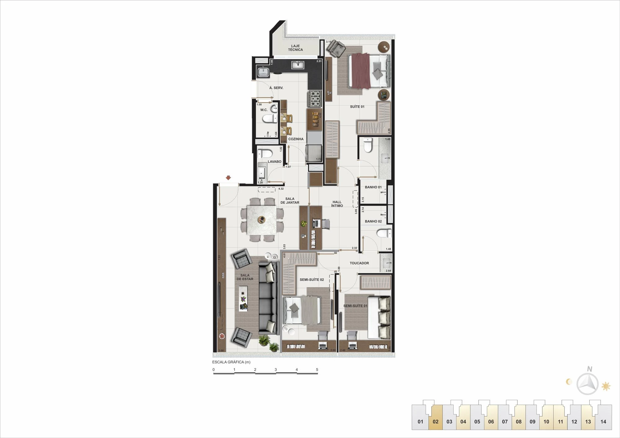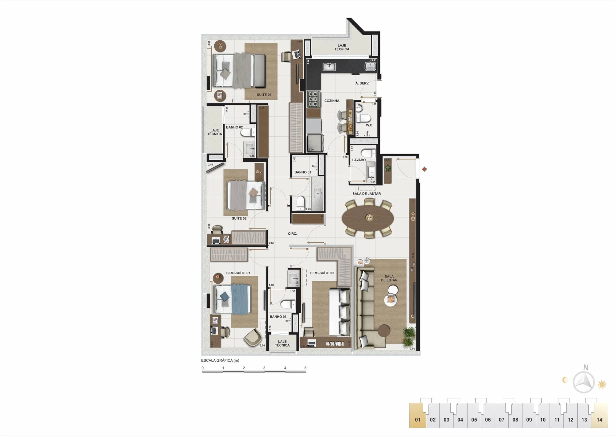 - 3 Quartos de meio com 119m² e 122m²: 1 suíte, 2 semissuítes e 2 vagas de garagem